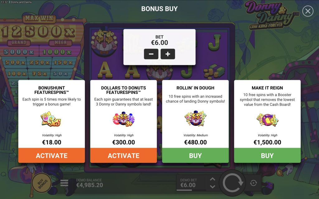 Bonus Buy options enable you to purchase direct access to these bonus features instead of waiting for natural triggers. In Donny and Danny, FeatureSpins can make bonuses several times more likely for a small markup, while full bonus buys cost a fixed multiple of your bet. Before committing funds, analyze expected value by comparing Donny and Danny bonus features against base game volatility and your bankroll size — variance ramps up fast when you’re chaining buys.